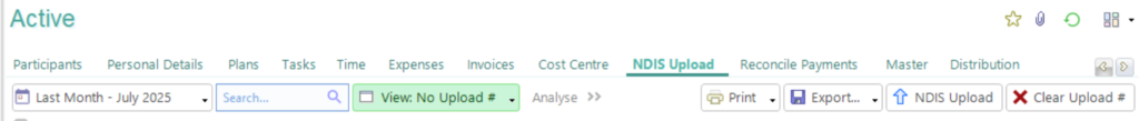 On the ‘NDIS Upload’ tab, the Clear Upload button will clear the upload# of all displayed rows that are ticked. This will reset the rows to a ‘not uploaded’ status.