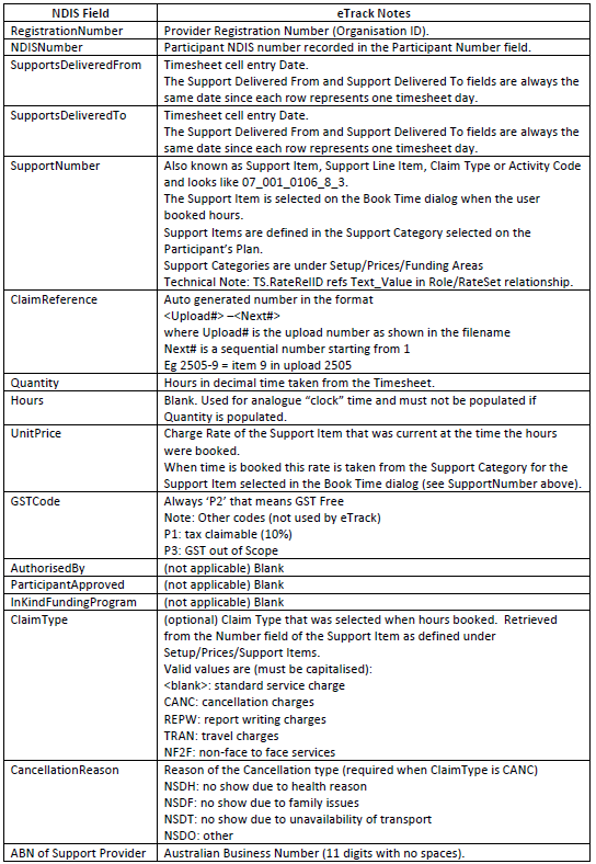Each row of the .CSV file represents the total hours booked by each staff member for each Support Item of each Plan in one day (if multiple staff book hours to the same support item/plan/date these are sent as separate rows). The following table lists the columns in the .CSV file and where in eTrack the data is retrieved from.